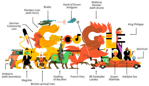 21 juli, nationale feestdag en Google viert mee. Zij lieten voor de gelegenheid een speciale doodle ontwerpen met 15 symbolen. Elk van die symbolen verwijst op de een of andere manier naar ons kleine Belgenlandje. De Doodle is gemaakt door grafisch ontwerper Sam Vanallemeersch. Hij heeft in Antwerpen gestudeerd aan Sint-Lucas en is nu grafisch ontwerper. Vanallemeersch haalt zijn inspiratie bij het modernisme, Bauhaus, de Franse strips en science fiction uit de jaren ’70.
